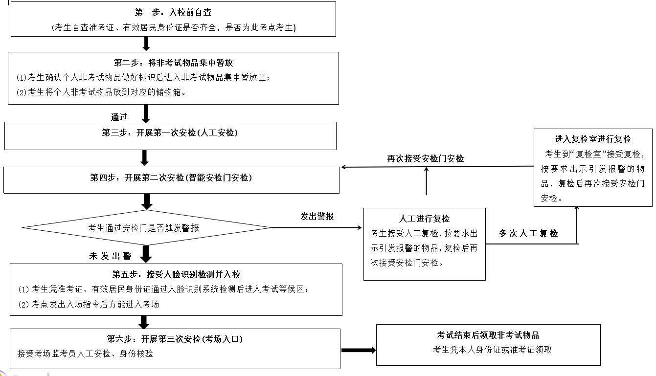 5、 考生通过“智能安检门”未提示报警的,前一名考生须完全走出门外后,后一名考生方可进入。考生通过“智能安检门”提示报警的,后一名考生需等待警报停止后再行进入。